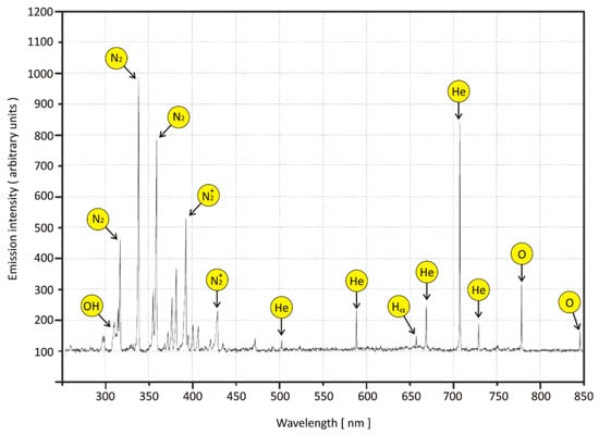 The recorded emission spectrum of the generated plasma, using helium as feed gas, is presented in Figure 4.