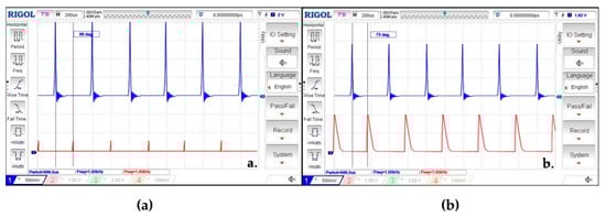 The initial phase angle (88 deg.) (Figure 7a) between the voltage and the current waveforms shows that the plasma applicator head has a capacitive behavior when the plasma is not ignited. The phase angle shifts down to 73 deg. (Figure 7b) when the plasma ignition is produced by the power drop in the plasma column (as a resistive load) and also by the plasma’s own capacitive behavior.