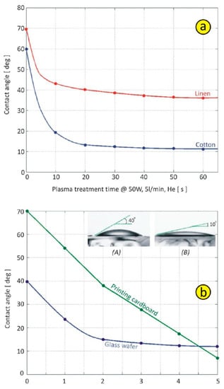 (a) Contact angle variation on plasma-treated cotton and linen samples. (b) Plasma-treated glass wafers and cardboardat50 W input power, as a function of treatment time.