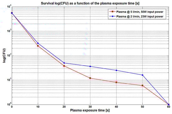 On the graph from Figure 9 we represent the survival CFUs as a function of the plasma treatment time. According to our literature study, the cold plasma’s sterilization performance ranks top notch, and there are just a few aggressive chemicals which can destroy the E. coli bacteria biofilms in such a short time [22,23].To compute the killing rates (CFU reduction speeds), the time necessary for complete sterilization, and the decimal reduction time (the treatment time required to destroy 90% of the original microorganism population) of the E. coli cultures, we used a linear fitting method on the data. The first observation was that there is no significant difference between the sterilization performances of the two sets of data (for two different plasma regimes). The E. coli inactivation process occurs with different rates, and thus the curves in Figure 9 show four slopes for the entire duration of the plasma treatment (60 s in this case). As you can see from the graph, in the first 10 s under the plasma discharge, the killing of the bacteria works very rapidly for both of the plasma operating conditions; the initial number of CFUs drops brutally from 5500 to approximately 300, giving an initial killing rate on the order of 500 CFU/s. For the rest of the treatment, the sterilization process becomes gradually slower as the killing rate is one order of magnitude lower after 20 s (20 CFU/s), and then, for the last part of the plasma treatment, the killing rate drops to only 1 CFU/s before the complete sterilization occurs after 60 s.