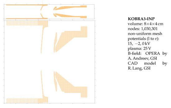 It has been found experimentally that an additional electron emitter has a strong influence on the ion beam intensity [18]. Such an emitter is located on the opposite side of the extractor. Electrons coming from such a biased disc see comparable magnetic fields as experienced by ions on the extraction side. They will not stay on axis, but drift to radial loss lines instead, see Figure 11. From this, it should be concluded that electrons coming from a biased disc are mainly accelerated to higher energy and do not contribute to SCC of plasma. The space-charge of, e.g., 200 eV electrons (for the voltage drop of a disk biased to −200 V) is much smaller than that from a few eV energy distribution of electrons.