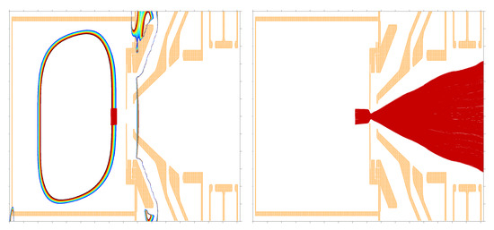 When using the “streaming plasma” model, the attached field line defines locations x, y, z where particles are generated. Magnetic field lines of interest are shown in Figure 6. Analyzing the path of magnetic field lines, it can be concluded that ions originated close to a radial loss line in the plasma chamber can be extracted as long as initial velocity components are sufficient. Using an adequate number of ion trajectories for each field line, the total number of trajectories for all field lines results in a very large (or even huge) number of trajectories to be calculated. To reduce the number of trajectories in the simulation, there are several options, for example, using not all places along a magnetic field line, but a representative selection of them only. For the magnetic flux density, a window (or a range) can be defined to create initial conditions only when B at this position is within that range. A shell-like volume is defined with such a model. Each shell represents a resonance zone for a specific electron energy. Two different zones are the result: one zone when the magnetic field line enters the hollow shell, see Figure 7 and the other when leaving this shell, see Figure 8. Ray-tracing has been made for both cases and comparison of both results indicates that there is only a small influence of the hexapole on the ion beam profile when starting the ions close to the extraction aperture (Figure 7), whereas the other condition (Figure 8) shows a clear influence of the hexapole. The extracted ion beam (still no space-charge) is shown in Figure 9 by two cuts, one perpendicular to the beam direction, the other in the beam direction. After six iterations (solving Poisson’s equation and doing ray-tracing, creating an updated space-charge distribution after each iteration), a self-consistent solution is found. The resulting potential including space-charge is shown in Figure 10.