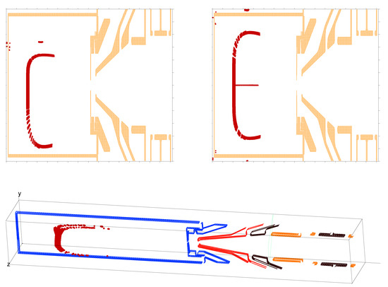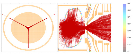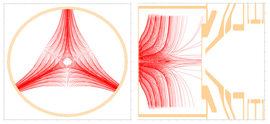 Ion trajectories (in red) within the plasma chamber (in orange), projected in the beam direction at 0.4 m with a projection depth of ±8 mm. The ions gyrate along the magnetic field line. See Figure 5 to identify this location close to the plane of extraction. The three wings in the plane of the extraction aperture have their origin in the radial plasma loss lines. In this projection, they appear like three -shape wings, shifted by 120°.