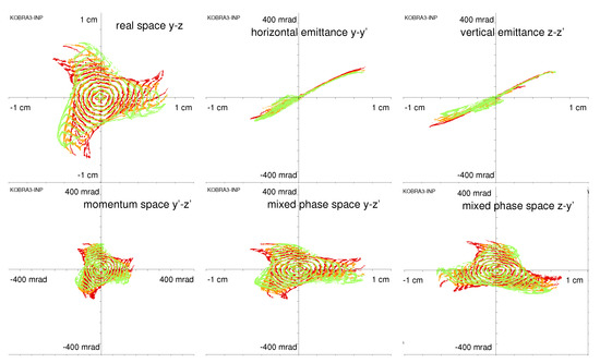 Different projections of the 6D-phase-space behind the extraction electrode (x = 0.45 m in Figure 5). Top row: real space, horizontal, and vertical emittance. Bottom row: momentum space, horizontal, and vertical mixed phase-spaces (horizontal angle against vertical position and vice versa). Scaling ±1 cm, ±400 mrad. Green: Ar, brown Ar, and red Ar. Each of these six projections contains 465,688 trajectories.