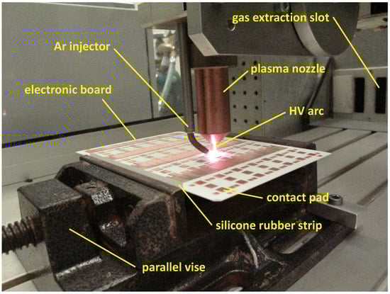 Furthermore, the transferred PAA was successfully used to reduce the oxides on electrically grounded silver or copper surfaces [55]. For this purpose, the forming gas (the mixture of nitrogen and hydrogen) was used as the ionization gas. As explained in Section 3.2, this method failed as for non-grounded substrates. The reduction process conducted with diffuse plasma is on orders of magnitude slower than with transferred arc plasma and, consequently, of no practical interest for this study. To demonstrate the effectiveness of the plasma bridge grounding, the plasma reduction of oxide on the electronic board described in Section 2.1 was used. The task was to make the contact pads on the electronic board free from oxides without damaging contact pads and the solder stopping paint.