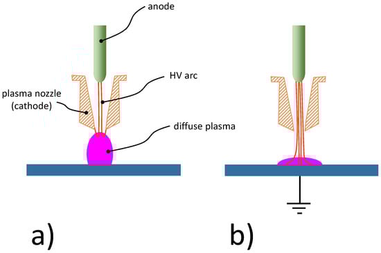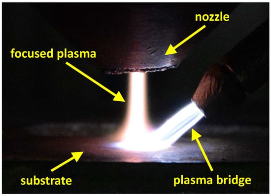 The HV arcs, which typically end at the nozzle lip, can transfer to the metallic substrate. This can occur only if the substrate is electrically grounded, as shown in Figure 4b. In the diffuse plasma mode, the arc starts at the inner electrode, is expelled several millimeters out of the nozzle, and ends on the nozzle lip. If the nozzle with ignited plasma approaches an electrically conducting and grounded surface or a surface with a large electrical capacity, then the arc transfers to this surface, forming a focused plasma (transferred arc mode plasma). A diffuse plasma, even though present, can no longer be seen, and the arcs are concentrated on a small spot on the substrate.