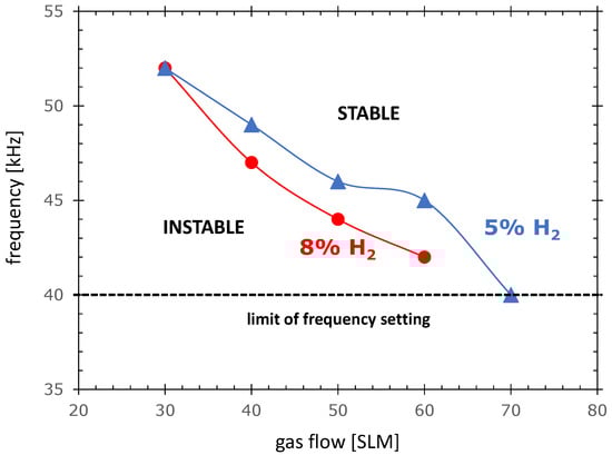 When operating the plasma generator with CDA, the PAA-PJ is stable for any pulse frequency and gas flow at the power level of 100%. The minimum frequency of 40 kHz selectable on the PS 2000 and the minimum CDA flow of 40 SLM recommended for operation with CDA ensure stable operation. This is not the case for nitrogen–hydrogen gas mixtures. The conditions of stable operation for N-H gas mixtures were investigated, and the results are visualized for 5% and 8% of hydrogen in Figure 5. Each curve represents the border separating the parameter zone of stable operation (right-top from the curve) from the zone of non-stable operation (left-bottom from the curve). With FG 95/5, the minimum setting of the frequency of 40 kHz resulted in stable operation only for a very high gas flow of 70 SLM or more. On the other hand, at a typical gas flow of 50 SLM, the stability can be ensured for pulse frequencies of more than 46 kHz.