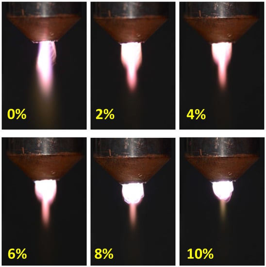 The influence of the hydrogen percentage (as depicted in the pictures of [43]) in the nitrogen–hydrogen gas mixture on the plasma jet with no arc transfer in free space. Conditions: total gas flow 60 SLM, frequency 62 kHz, power 100%.