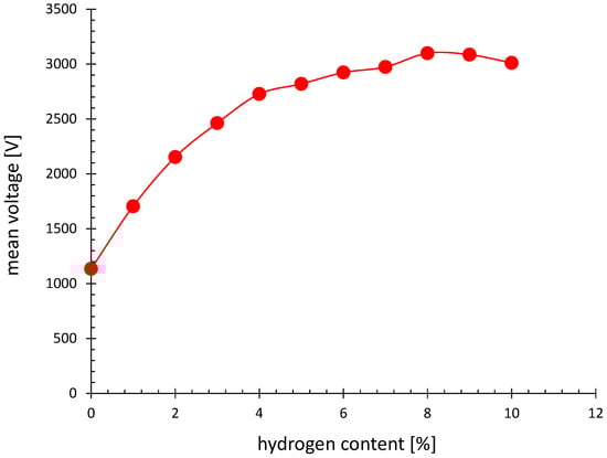 Although the arc length decreases with the hydrogen percentage, the mean voltage drop along the arc increases (see Figure 7) from the 1.2 kV typical for pure nitrogen to 2.5 kV for the gas mixture with 10% of hydrogen. Since the plasma jet power was controlled to be constant by the power source, the mean current flowing through the jet decreased with increasing hydrogen percentage. This means that either the diameter of the arc or the electric conductivity within the arc diminishes. This explanation can give the increase of the free path for electrons with an increasing concentration of particles with a smaller cross-section for electron impact ionization, resulting in lower ion production rates and, consequently, lower conductivity. The other reason can be the thermal one. Since hydrogen has much higher heat conductivity than nitrogen, the arc should tend to be colder with increasing hydrogen percentage and, consequently, have a higher molecular concentration, resulting in an increased breakdown voltage.