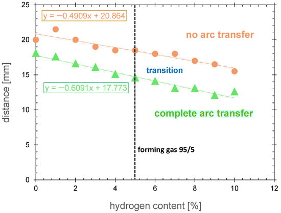 Since, for the arc transfer to the grounded substrate, the distance from the arc to the substrate should be electrostatically shorter than to the nozzle lip, it can be expected, that the distance for arc transfer will decrease with increasing hydrogen percentage, because the arc zone is shrinking, as discussed in Section 3.1.3. This prediction was confirmed by the investigation of the transition of the jet operation from non-transferred to transferred arc mode [30], summarized in the following.