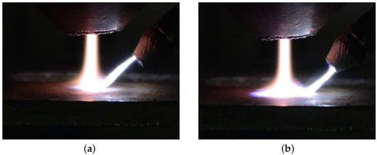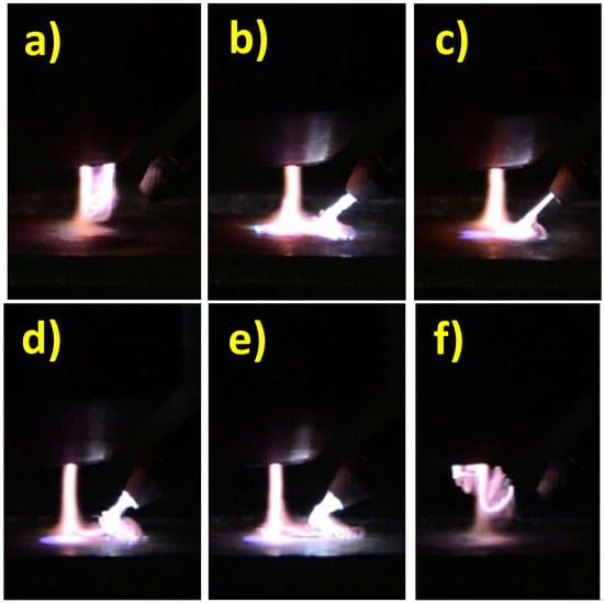 Figure 11a shows the situation before the start of argon flow. The arc is not transferred and the plasma bridge not ignited yet. The arc cone is deformed. The asymmetry observed in the arc trajectories can be explained by the electrostatic influence of the grounded injector. The arcs facing the injector are bent more in its direction at a smaller distance from the nozzle than arcs facing away from the injector, because they are attracted by the injector. However, the electric field is not sufficient to cause the gaseous breakdown between the nozzle and the injector in a gaseous environment without argon. The arc transfer and plasma bridge ignition occur in the time between the frame shown in Figure 11a and Figure 11b, one frame later. The time between the frames was 1/60 s. This means that the ignition process’s duration was less than 17 ms.