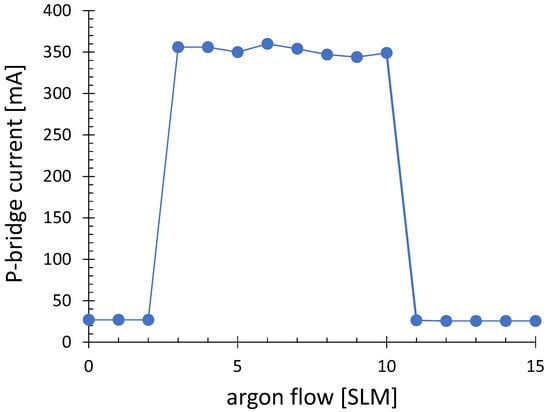 Figure 12 shows the dependence of the mean current flowing from the substrate to the injector through the plasma bridge. The current vanishes for an argon flow lower than 3 SLM and higher than 10 SLM, which correlates visually with the non-existent plasma bridge. At an argon flow below 3 SLM, the argon-enriched zone does not expand sufficiently to short-cut the electric gap between the biased substrate and the injector. The possible reason for the disappearing of the plasma bridge for an argon flow over 10 SLM is the transition of the argon flow from laminar to turbulent, resulting in the disruption of the argon bridge discharge structure. However, other technological factors limit the maximum value of the plasma bridge argon flow far below 10 SLM: