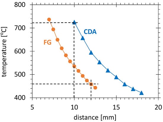 where is the pre-exponential constant, is the activation energy of the diffusion process, and R is the universal gas constant. The pre-exponential constant and the activation energy valid in the temperature range from to are [62] . and , respectively. From the forming gas curve in Figure 13 at a distance of 12 mm from the nozzle, the static temperature of was reached. Due to low heat capacity and high heat conductivity of the thin copper layer, it was assumed that it reaches this temperature during the interaction time with the plasma plume.