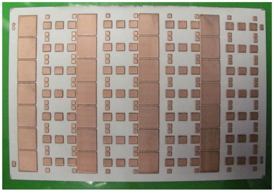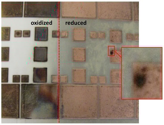 The electronic boards provided by AB Mikroelektronik GmbH were used as test substrates for oxidation and reduction process demonstration (see Section 3.4). They are AlO plates with a size 175 mm × 120 mm × 1 mm and are covered with non-connected square contact pads made of copper. The squares have different areas. There are 88 contact pads with an area of 175 mm, 84 with 32 mm, and 112 with 8 mm.