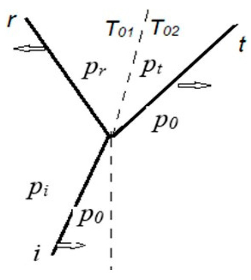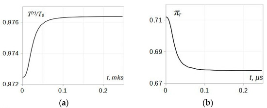 Counting the distance x to the left from the origin, as shown in the graph in Figure 4, the value of x at the point of reflection becomes fixed, x = 0, and thus the parameter distribution in the zone is a function of time only, . Then, using this function in the refraction Equation (2), a non-stationary solution for the normalized pressure πr in the reflected wave can be found. The temporal change in the distribution πr occurs during the transitional period , where tλ is the relaxation time. After that, a stationary state corresponding to a new equilibrium established at the end of the relaxation zone in the gas takes place again.