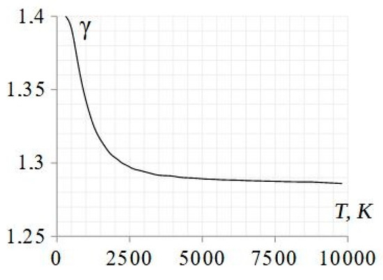 The parameters λ in both media across the interface taken as equal, and λ1 = λ2, can be used to simplify Equation (2). The reason for this is the fact that the specific heat ratio γ in the gas is affected strongly up to approximately 2500 K and then, as the temperature increases to 10,000 K, it has a tendency to saturate at a constant value of approximately γ =1.2860 [16]. Thus, when the gas heating is intense on both sides of the interface, the difference in the parameters becomes insignificant. The graph of Figure 2 illustrating this property is plotted assuming excitation of vibrations only and no dissociation in the gas.