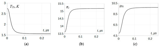 An illustration of the solution to Equation (2) was performed for particular conditions, the shock Mach number Mi = 3.5 in N2 at 5000 K, for which the incident shock temperature profile (5) can be utilized. Numerical results for the flow parameter distribution in the relaxation zones across the head of the rarefaction wave fan (in the reflected wave) and across the front of the transmitted shock are presented in Figure 5. The pressure distribution across the transmitted wave πt is obtained using condition (4) and the temperature distribution T21(t) using relationship (9).