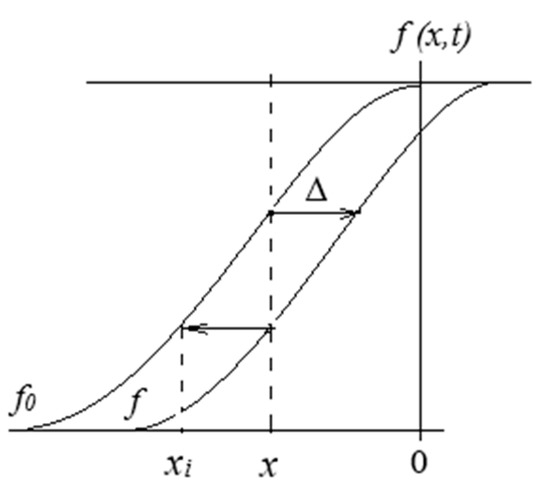 The initial temperature distribution function obtained in the relaxation zone behind a shock propagating free in the incident medium (denoted as f0) is given in terms of a distance x from the front, and is defined up to the moment when the shock front hits the interface. As the front advances into the hotter medium, the continued relaxation in the gas in front of the interface results in the parameter distribution being dependent on the interaction time t. The temporal change of the initial distribution function f0 at the point of reflection is equivalent to its shift to the right with the shock wave speed Vsw at the distance ∆ = Vsw t (Figure 4). As seen in the diagram, at a current time t and a location x within the relaxation layer, the shift results in a transition from the initial function f0(x, t) to that at the distance xi = x + ∆, i.e., f0(x, t) → f(xi, t) = f0(x + ∆, t), thus yielding a new distribution: