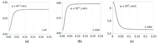 When analyzing the data, the following processes explaining the specifics of relaxation in the gas must be considered. The excitation of vibrations in the gas compressed by the shock wave and an increase in time of the vibrational energy component results in a continuous decrease in the gas temperature across the relaxation zone of the incident wave (DT = 0.432, Table 1 and Figure 3a) and a moderate gas compression (Dp = 0.103, Figure 3b,c), the feature commonly observed in real gases [17]. The effect mostly shows up in the gas density, for which the relaxation depth is almost five times stronger than for the pressure (0.103 vs. 0.490 accordingly), and similar to that for the temperature. The additional compression built up across the zone drives an increase in the flow speed ui with time (0.061), in a degree comparable to that for the pressure. The relaxation time of around 0.150 μs is common for all three gas parameters.