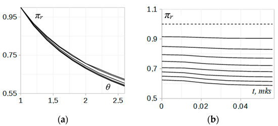 The dynamics in the relaxation zone parameter distribution during the transitional period have been demonstrated here for specific plasma and shock conditions, assuming fixed values of the incident shock intensity and the heating strength across the interface. To explore for possible tendencies or limitations in the relaxation parameter behavior, the model relationships can be analyzed by their variation with the two parameters. First, by varying the heating strength θ within a small interval of temperatures T02, the temporal profiles of pressure ratio πr can be calculated. In the absence of significant dissociation and the heat capacity ratios being close to equal, γ1 ≈ γ2, θ is reduced to the initial gas temperature ratio, θ = T02/T01. If keeping the incident shock Mach number fixed, the extended structure of the incident wave (5) will not change. Then, the pressure jump in the reflected portion of the wave will be described with the same relation (2), but now in the interval of θ values. The key variable in the calculations, πr, then can be used to determine all the remaining variables for the reflected and transmitted waves using relations (9), (12), (13) and (15).