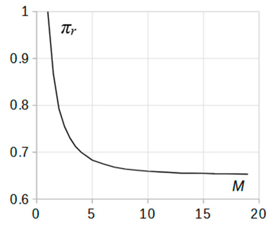 Therefore, the main effort can be focused on exploring the shock reflectivity vs. Mi to determine the reflected and transmitted wave intensities at x = 0, and then the extension zone profile can be reconstructed using the method described above. For this, first, the transcendental Equation (2) can be analyzed to find a solution for πr (Mi, θ, x = 0) as a function of the incident Mach number (with θ as a fixed parameter), and then for the transmitted shock strength πt (Mi, θ, x = 0), with the quantities defined as the reflection and transmission coefficients, accordingly:
