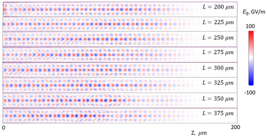 Longitudinal accelerating field at different propagation distances. The wakefield is resonantly excited by the beating of the two laser pulses.