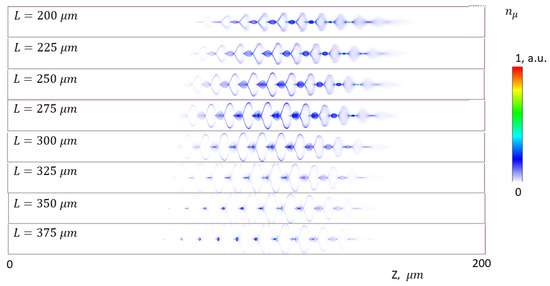 To verify the possibility of acceleration without dephasing, we inject a test muon bunch with the initial (corresponding to , equal to the expected wake phase velocity) and the sizes m and m. The muon density is considered to be very low in these simulations, so we have no beam loading of the wakefield. The evolution of the witness bunch density is shown in Figure 3. The longitudinal phase space is given in Figure 4. We can see that the relatively slow muons are resonantly accelerated by the subluminal wakefield. As they gain significant longitudinal momentum, they start to overtake the wake, and the rate of their energy gain reduces. To overcome this problem, one could use a tapered plasma waveguide. However, this topic is out of the scope of the present work, and will be studied in further publications.