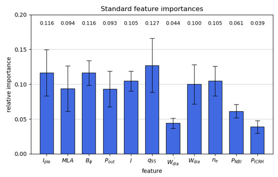 Random forest (RF) solves classification problems using many different decision trees (DT). DTs are tree-like data structures where each branch point represents a decision point. There, one or more variables can be evaluated and based on the outcome; the process will continue along the corresponding branch to the next branch point. This continues until it reaches one of the end points of the tree, known as the leaves. However, singular DTs are not well suited to represent the behaviour of the disruptions. DTs are characterised by a high variance error and are thus prone to overfitting. This can be overcome by combining the outputs of many DTs through a majority voting system, which makes for a much more robust classification model. The influence of each DT towards the final decision is adjusted during the training process based on their individual performance. A detailed discussion about RF and their training can be found in Hastie et al. [30] (Chapter 15). RF was also implemented using Scikit-learn. It used 1000 initial DTs without a maximum tree depth and bootstrap set to true. As maximum features per split, it used 3 and 2, respectively, for the standard and dimensionless model. The minimum samples per leaf and minimum samples per split were 1 and 2, respectively. The RF method allows for the analysis of the relative importance of the different inputs. A discussion on how this works can be found in Hastie et al. [30] (pp. 367–369, 593). Such an analysis is discussed in Section 4.3.