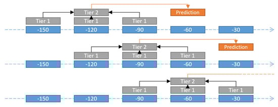 The simplicity of the model and its low computational cost make it an excellent tool for quick iteration and testing. It has also been used in previous work, such as Moreno et al. [9]. It was implemented using the python package Scikit-learn [31]. It uses the non-linear radial basis function (RBF) as a kernel with regularisation parameter and kernel size . Based on Moreno et al. [9], a 2-tiered SVM classifier was also designed. It works based on a sliding window scheme where the first tier SVMs will observe 3 subsequent timesteps. The results of the 3 first tiers are then used by a second tier SVM, which outputs the final classification. A schematic of this is shown in Figure 2. The first tier is identical to the standard SVM, except that it outputs probabilities rather than discrete classification, while the second tier uses a linear kernel and . Due to the implementation in Scikit-learn, the two tiers were trained independently. This means that errors could not propagate from the second into the first tier SVMs. This shortcoming is expected to have a negative impact in the performance of this model.