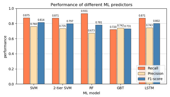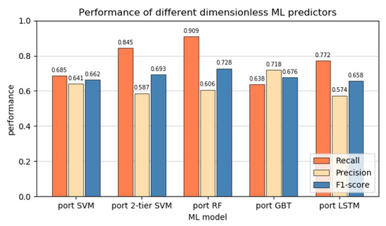 Figure 6 shows dimensionless predictor performance metrics. There is an overall decrease in performance across the board. This can most likely be attributed to the loss in information in the transition from standard to dimensionless inputs. In the latter, the 10 original inputs are combined into only 6 features. However, it can be observed that not all ML methods are equally sensitive to this transition. SVM and LSTM, which had the best performance in the standard models, had a drop of around in the F1-score. The two-tiered model only dropped about . GBT and RF experienced the lowest impact with a drop of only . This makes RF the best performing among the dimensionless models. We cannot offer a clear explanation for the different sensitivities, but empirically this suggests an advantage for RF and GBT for the design of the dimensionless models. To more comprehensively test the effective portability of different models, they should be tested on different devices, as was for example conducted in Rea et al. [13], but this was outside the scope of this work.