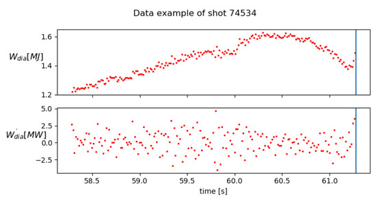 Example of diamagnetic energy and its time derivative, showing the noise on the signals. The vertical line is the moment of disruption.