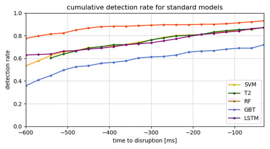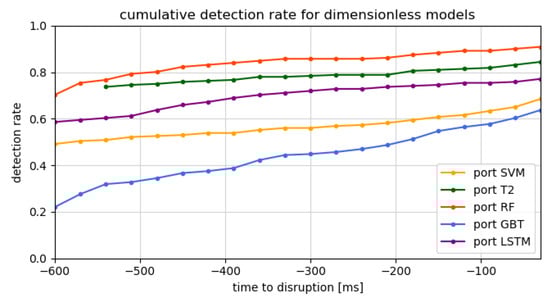 Figure 7 and Figure 8 show the evolution in time of the detection rate before a disruption for, respectively, the standard and dimensionless models. The detection rate is the ratio of detected disruptions over the total disruptions. It therefore indicates when disruptions are detected for the first time in the 600 ms disruptive samples. The right-most value in these graphs corresponds to the total detection rate, which is the same as the reported recall. For all the models, the detection rate starts at a high value. This indicates that a significant fraction of the disruptions are already detectable at 600 ms before the disruption, suggesting that in future work, a longer time window before the disruption should be considered. This seems to be confirmed by comparing to Figure 5 of López et al. [38], where defections in JET data are measured as early as 2 s in advance. Of course, this does not necessarily justify increasing the disruptive time scale, as this would also increase the false alarms. The high initial detection rate can also be inflated by false alarms. If the false alarm rate is high, the model predicts a high amount of disruptions, even when they are not imminent. This high amount of unfounded detections would also happen close to the disruptions, but would in this case be labelled as a correct detection and thus create a background detection rate. The false alarm rates of the different models are listed in Table 3. A high false alarm rate indeed corresponds to a higher initial detection rate. Nonetheless, the false alarm rates are not large enough to fully explain this on its own. Notice that the two-tiered models start at −540 ms. This is due to the sliding window scheme, requiring three datapoints to work.