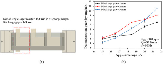 The discharge gap is considered to be one of the most crucial parameters in DBD reactor configurations that affects the initial discharge voltage and power density, thereby determining the decomposition characteristics of the DBD reactors for exhaust gases [3,22,28]. To determine the optimum discharge gap distance for large-flow DBD reactors, part of the single-layer DBD reactor discharge length (equal to 150 mm) was adopted to investigate the effects of discharge gap thickness (for values in the range of 1–3 mm), as shown in Figure 3a. The toluene to be decomposed was diluted with air to a concentration of 100 parts per million (ppm), adjusted by the MFC to a flow rate of 50 L/min, and humidified through a water bath. In this study, the temporary reactor was energized by high voltages at 50 Hz (f) in the range of 15–21.5 kV (zero-to-peak value).