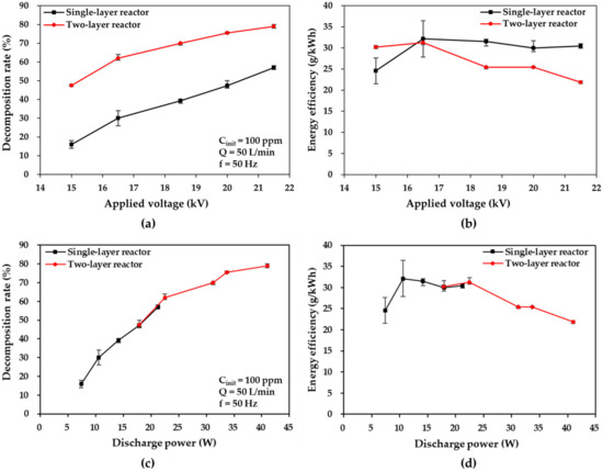 Conversely, the energy efficiency increased initially and then decreased slightly as the applied voltage increased in the single-layer reactor case; the two-layer reactor presented a similar trend, but the response was better than that of the single-layer reactor at the applied voltage of 15 kV and comparable at 16.5 kV. Subsequently, the response decreased considerably, as shown in Figure 5b. The energy efficiency changes from 24.57 g/kWh to 32.14 g/kWh, drops to 30.44 g/kWh at 21.5 kV in the single-layer reactor case, and slightly increases from 30.20 g/kWh to 31.27 g/kWh before decreasing to 21.85 g/kWh in the two-layer reactor case. This finding may be attributed to the fact that a partial discharge occurred at a lower applied voltage range; this produced an insufficient quantity of high-energy electrons and active species that contributed to the decomposition of toluene, and thus resulted in higher energy efficiency [25,26]. However, the partial discharge gradually changes into a full plasma discharge with an increase in the applied voltage, thus resulting in the generation of an excessive number of high-energy electrons and active species. This causes a decrease in energy efficiency; this phenomenon was more prominent in the two-layer reactor due to the considerably higher decomposition rates. These findings indicate that the two-layer reactor can process faster flow rates. In addition, when decomposition occurs at the same discharge power, the single- and two-layer reactors yield similar energy efficiency outcomes, as shown in Figure 5d. These results demonstrate the feasibility of the two-layer reactor and its superiority in energy efficiency due to the higher decomposition rate compared to the single-layer reactor.