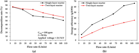 In conclusion, the two-layer reactor is superior to the single-layer reactor in terms of the decomposition rate at all flow rates; however, in terms of energy efficiency, the single-layer is more advantageous. This implies that the two-layer reactor may be overqualified for use in the flow-rate range of 10–110 L/min and could be adapted to handle much higher flow rates to achieve comparable or larger energy efficiencies than those of the single-layer reactor.