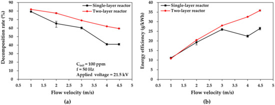 As shown in Figure 7b, as the flow velocity increased from 1 to 4.583 m/s, the energy efficiency increased from 11.16 to 26.43 g/kWh in the single-layer reactor case and from 10.80 to 35.85 g/kWh in the two-layer reactor case. The energy efficiency in both reactors increased at increased flow velocities; this can be attributed to the increased number of toluene molecules per unit discharge time. It was also found that the difference in energy efficiency between the two reactors increased as the flow velocity increased. This is because the toluene decomposition quantity was lower in the single-layer reactor case due to the more abrupt decrease in the decomposition rate. Therefore, regarding the decomposition rate and the higher level of energy efficiency, the decomposition performance of the two-layer reactor is superior to that of the single-layer reactor in terms of flow velocity. Additionally, the processing capability of the two-layer reactor is double that of one-layer reactor at the same flow velocity.