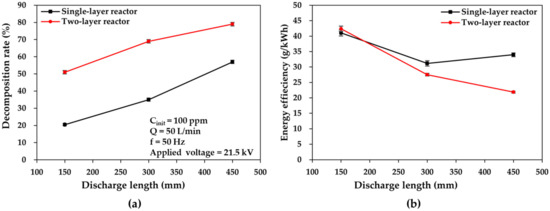 However, the corresponding energy efficiency in the single-layer reactor decreased from 41.08 to 33.98 g/kWh as the discharge length increased (Figure 8b). It was also reported that the increased discharge length caused an increase in power consumption for the generation of an enlarged plasma zone [36], which led to a higher decomposition quantity per discharge time in the single-layer reactor case; in turn, this finally improved energy efficiency. Conversely, the two-layer reactor exhibited the same trend (from 42.39 to 21.85 g/kWh), but the decrease in energy efficiency was considerably higher. In the two-layer reactor, however, the excessive energy input caused by the increased discharge length caused a more abrupt decrease in energy efficiency compared with the single-layer reactor, given that the larger discharge space can yield a relatively greater decomposition quantity per discharge time at shorter discharge lengths. Nevertheless, it still exhibited comparable energy efficiency for a broad range of discharge lengths. These findings prove the superiority of the multilayer structure of the two-layer reactor in terms of the discharge length and provide directive data for the future configuration design of large-flow DBD reactors.