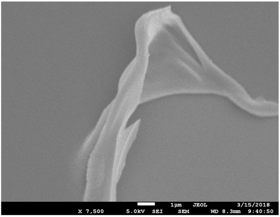 The SEM image of the PS film (Figure 3) shows a smooth surface, which will be further examined under AFM in the following section. The film thickness, as estimated from the diamond stylus-based contact profilometer, was ~180 nm. The PS film was chosen as a virgin platform for the attachment of different chemical groups since it contains only carbon and hydrogen and is easy to be functionalized at low temperatures. Due to the very low thin and smooth film, surface morphology could not be revealed. The area shown in Figure 3 represents a small polymeric segment protruding out of the otherwise very smooth film. The edge of the flake-like feature also confirms the film thickness to be sub-micron.
