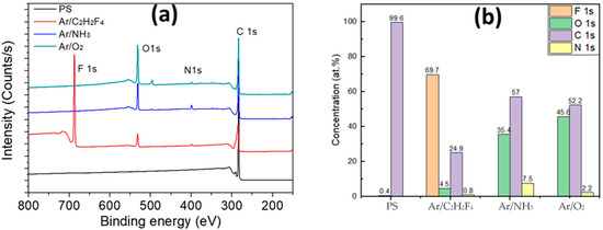 XPS survey spectra of the untreated and plasma-modified PS films are presented in Figure 4. The carbon element is omnipresent for all samples at 285 eV binding energy (the binding energy is charge corrected in all the XPS spectra). The untreated PS film exhibits the presence of 99.6% carbon at the surface, implying it is contamination-free since it only consists of aromatic and aliphatic carbon as well as hydrogen (not detectable by XPS). After plasma treatment, a strong nitrogen peak at 401 eV is detected that accounts for 0.8, 7.5, and 2.2 at.% nitrogen of the surface atomic composition after Ar/C2H4F4, Ar/NH3, and Ar/O2 plasma treatments, respectively. The area of oxygen peak at 531 eV is noticed to increase from 0.4% for pristine PS surface to 4.5, 35.4, and 45.6 at%, respectively, upon modification with Ar/C2H4F4, Ar/NH3, and Ar/O2 plasma. After Ar/C2H4F2 plasma treatment, a strong intense new peak is observed at 688.0 eV that may be associated with F 1s with 69.7 at% of all the elements. The relatively low nitrogen content suggests the presence of nitrogen atoms only on the extreme upper level of the modified PS surface with presumably a few nanometers depth. This is due to the fact that the depth of analysis in the case of the XPS technique is limited to ~10 nm, considering the photoelectron take-off angle in the spectrometer to be 90°. It may be surprising that the relative amount of oxygen is also more important than that of nitrogen after Ar/NH3 plasma treatment. However, plasma treatment activates the surface via the generation of free radicals and other charged species. These species can react with the surface and/or with other molecules present in the atmosphere of the plasma chamber, and later with ambient air once the substrate is exposed to the atmosphere during post-plasma treatment storage. The surface chemistry evolution will depend on the environment to which the surface is exposed to after plasma treatment [34]. In that case, post-treatment exposure to air or water, for instance, may yield significantly different surface chemistries for the same plasma-modified surface [37]. The film surface chemistry and composition, as estimated by XPS, before and after plasma treatment, are graphically presented in Figure 4b.