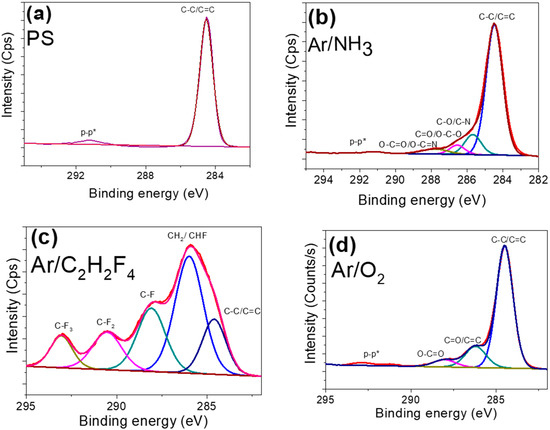 A comparison of the carbon peaks before and after plasma treatment is made, as shown in Figure 5. Untreated PS only exhibits one large peak caused by the C-C aliphatic chains and -C=C bonds from the phenyl ring [38]. Another minor peak, a satellite π-π* peak that is common in aromatic polymers, can be seen at a high binding energy of ~291.0 eV [39]. The carbon peak in the plasma-treated samples shows a noticeable change in shape, indicating the development of several functional groups at the surface. It is possible to identify functional groupings by breaking down the observed peak into two or more constituent component peaks, as indicated in Figure 5. When NH3 is added to argon plasma, NHx-based species are produced that interact with the PS surface [40,41]. The component in the C1s signal at the binding energy (BE) of 284.6 eV was much decreased in intensity by ammonia addition; however, the components at about BE ≈ 286 eV and BE ≈ 288 eV was strongly increased. The peak positions as well as the intensities of the subpeaks are too high to be interpreted as NH and NH2 groups. The peak positioned at 287 eV may be more likely to be assigned as carbonyl functional groups (C=O and O-C-O) formed during the post-plasma phase. Figure 5c demonstrates how the inclusion of fluorine leads to the attachment of various functional groups, including CF3, CF2, and C-HF [8,42]. Figure 5d revealed a set of four distinct peaks appearing because of the Ar/O2 treatment process. The maximum of each peak was shifted toward higher energies with respect to the hydrocarbon signal at 284.6 eV, which is consistent with the formation of oxidized units in the polymer chains [43]. The peak at 286 eV reveals the presence of carbonyl groups (C=O) at the surface yet may equally relate to carbon associated with two oxygen atoms (e.g., O-C-O). The peak at 289 eV corresponds to carbon in acid and ester groups (O-C=O). Finally, the spectrum showed a shakeup energy peak at 291.8 eV, accounting for the π-π* bond, which is assigned to the undamaged benzene ring in the PS surface [43].