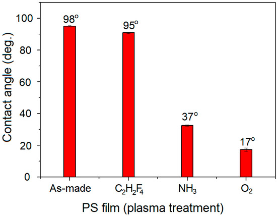 A promising technique for the modification of chemical and physical properties of polymer surfaces without impacting the bulk material is plasma treatment [6,7,8]. Although plasma treatment is frequently used, there is still some debate over the relative significance of the many plasma–polymer interactions that take place at the surface that can result in the production of free radical sites. Oxygen plasma treatment has been widely reported to increase the wettability and adhesion of polar polymers such as PS [9]. Nonetheless, the effect of different plasma treatments is rarely reported. Exploring different plasma chemistries would allow us not only to tune the surface hydrophilicity but also to graft other chemical groups that could keep the surface hydrophobic yet allow their use for different purposes.