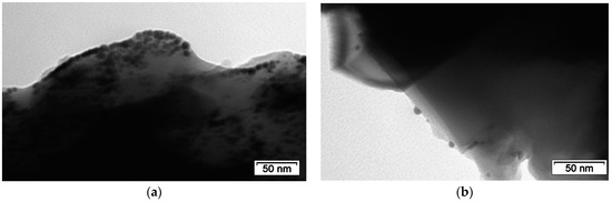 The TEM micrographs of Au NPs deposited onto the PS are shown in Figure 7a,b. In some regions (Figure 7a), one can observe the agglomeration of Au NPs with different size distributions. The microstructure recorded at the substrate edge (Figure 7b) demonstrates the presence of isolated Au NPs, thus indicating an inhomogeneous type of Au NP deposition at the PS support surface.