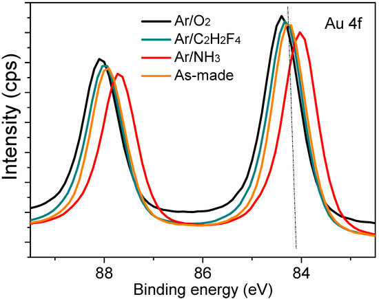 Figure 8 shows the XPS Au 4f core level spectra for the Au NPs deposited on either untreated or plasma-modified PS films. For the untreated PS film, the Au 4f peak, located at 84.1 eV, represents Au in the metallic state [43,45]. This implies that every sample of the Au NPs is in a charge-neutral, bulk-like state. There was no shift in the XPS Au 4f peak position arising from Au NPs deposition on the Ar/C2H2F4 plasma modified PS surface, thus suggesting that there is no evidence of any chemical interaction between the Au NPs and the PS support polymer with fluorine groups. However, a negative binding energy shift of about 0.2 eV for the Au 4f peak was noticed in the case of Au NPs deposited on Ar/NH3 plasma functionalized PS film. On the other hand, a positive binding energy shift of about 0.2 eV for the Au 4f peak was also measured in the case of Au NPs deposited over Ar/O2 plasma-treated PS.