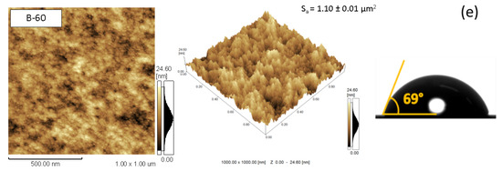 The results can be attributed to the morphological pattern change observed in the sample B-15 and the significant enhancement of OH species concentration on its surface, which will be discussed later. Similar results were obtained by Han et al., who attributed the improvement in hydrophilic character to the presence of OH radicals capable of forming hydrogen bonds with water molecules [36]. However, for HCHP treatment durations longer than 15 min, we believe that the morphological changes were the primary factor in decreasing the surface energy, as we detected similar content of OH groups in the samples B-15, B-30, B-45, and B-60 (see Section 3.4) but different morphological patterns and surface area reduction after 15 min of hydrogenation. Thus, we propose that the changes observed in B-15 (the emergence of more pronounced valleys among the smaller grains) were the main contributor to the reduced hydrophilic behavior, i.e., the decrease in surface energy following 15 min of HCHP treatment.