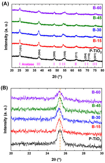 Furthermore, the P-TiO2 average crystallite size was approximately (86.5 ± 7.7) Å, while the samples hydrogenated for 15, 30, and 45 min displayed an average crystallite size ranging from (89.7 ± 11.3) Å to (96.7 ± 9.0) Å. In contrast, B-60 exhibited a decrease to (73.0 ± 2.8) Å, which can be related to the previous discussion.