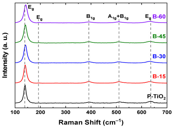 As depicted in Figure 4, micro-Raman spectroscopy analysis was conducted to evaluate the anatase TiO2 vibrational modes. Only anatase TiO2 vibrational modes could be detected for all samples, in agreement with the XRD results. However, by analyzing the position and profile of the main Eg anatase vibrational mode (approximately 140 cm⁻¹), some interesting behaviors could be observed.