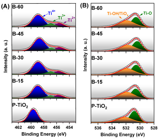 Surface chemical states and composition relating to each sample were investigated using XPS analysis by deconvolution of the Ti 2p3/2 and O 1s high-resolution spectra, as shown in Figure 5a,b, respectively.