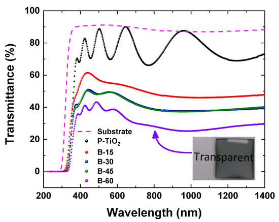The optical properties of the black TiO2 thin films were investigated using a UV-Vis-NIR spectrophotometer (Jasco, model V-570, Tokyo, Japan). This instrument is equipped with a 150 mm integrating sphere, and transmittance measurements were conducted over a range of 190 to 2500 nm, with the incident radiation directed normally onto the samples.