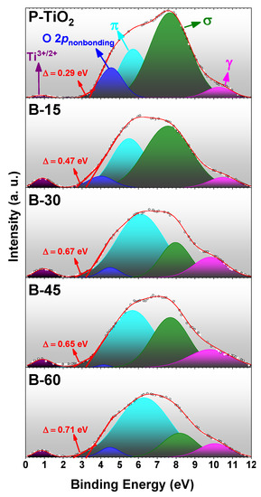 Furthermore, the valence band (Figure 7) can be deconvoluted into four peaks centered at 10.3 eV (γ), 7.7 eV (σ), 5.7 eV (π), and 4.5 eV (for the pristine sample), which are attributed to OH groups, π-type molecular orbitals, σ-type molecular orbitals, and nonbonding O 2p orbitals, respectively [37]. Additionally, another peak centered at 0.8 eV (for the pristine TiO2) can be fitted to the acquired spectra and is associated with the Ti3+/2+ 3d states. These in-gap states, along with the tail states, contribute to narrowing the bandgap and consequently increasing light absorption [47], which is in line with the spectrophotometry results.