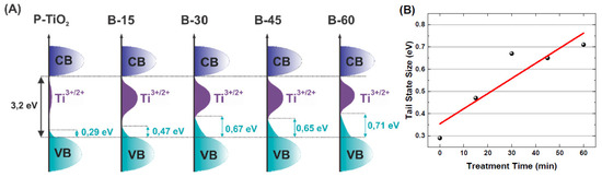 (A) Schematic representation of defect Ti3+/2+ and tail states occurring between the valence and conduction bands; (B) the increase in tail state size as a function of HCHP treatment time, with the red line representing a linear fit.